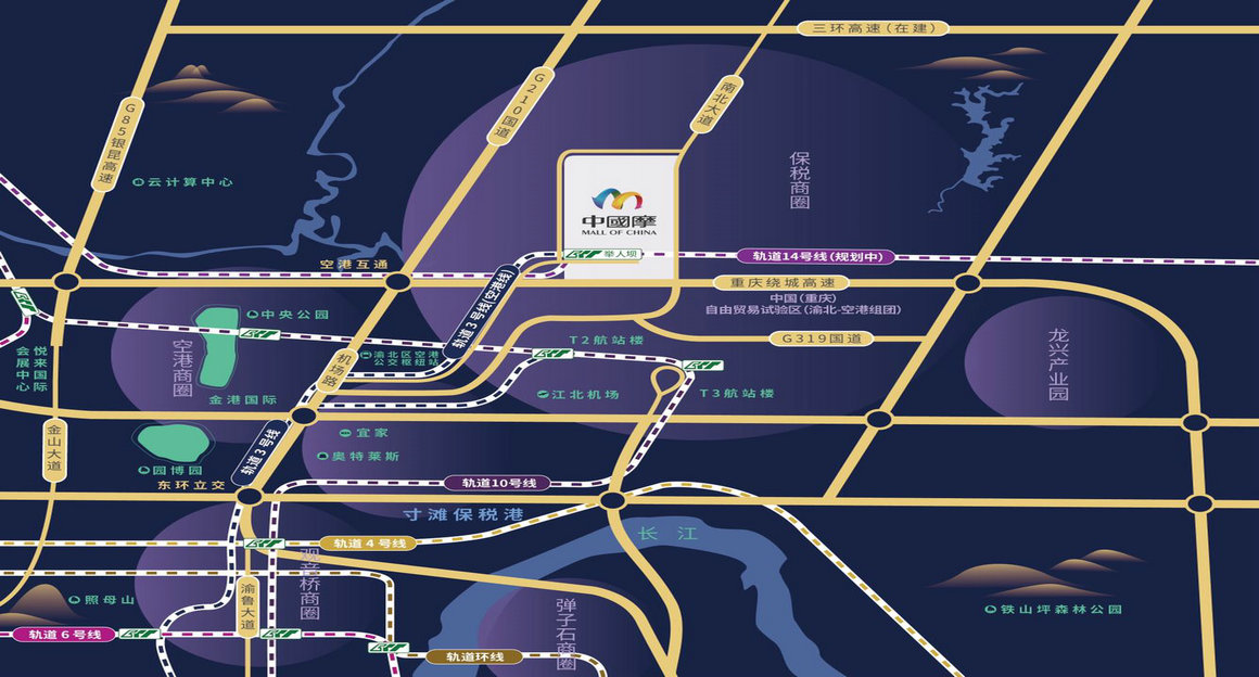 中国摩,位于重庆城市向北的热点区域——重庆两路寸滩保税港空港功能区(轨道3号线举人坝站旁)。