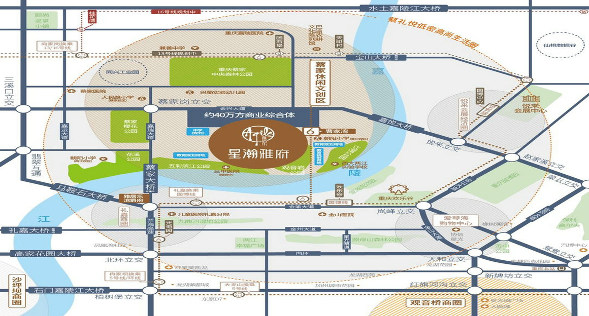 “双轨(16号线规划中)四横六纵七桥”路网,畅连全城;蔡家中央森林公园、五彩滨江公园等五大公园环绕,自然滋养品质生活。蔡家医院、重庆嘉瑞医院、礼嘉儿童医院等形成齐备的医疗资源配套。