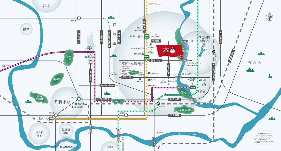 项目五个大公园环绕,超千亩山水景观。毗邻御临河,临近明月湖、飞龙湖公园、火凤凰足球场环绕,成为重庆最具“耍事”的后花园。