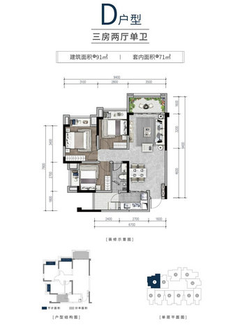 面积:建面面积54平-91平