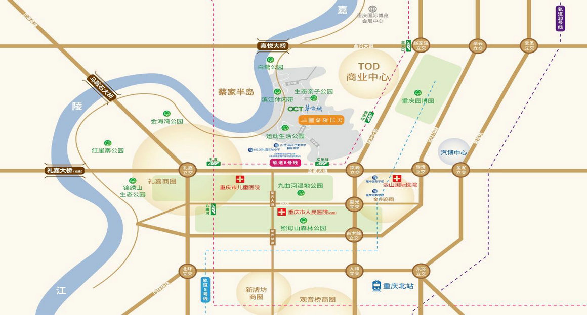 项目毗邻生态亲子公园、云顶艺术公园、运动生活公园,俯瞰重庆欢乐谷公园、玛雅海滩水公园及嘉陵江湾;小区内【两轴、三环、七庭、七园】的景观设置,强调园区生活丰富多彩。