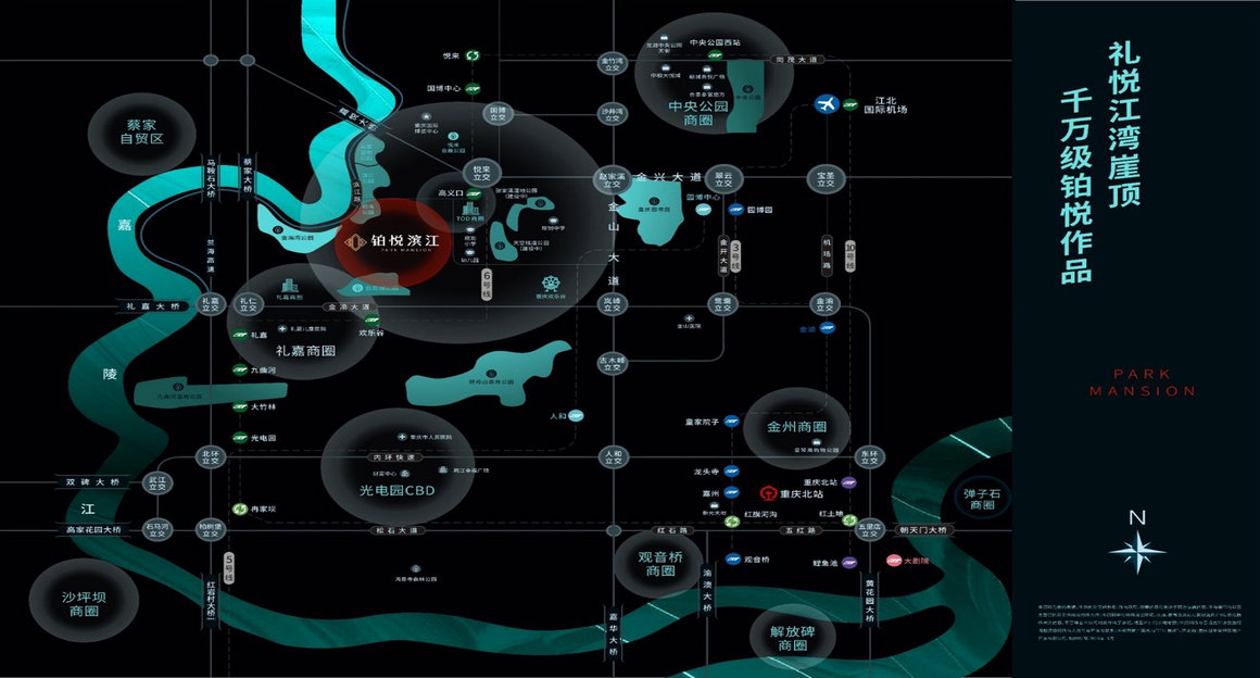 铂悦滨江项目由旭辉、华宇、华侨城联合开发,择址重庆两江新区悦来生态城。项目雄踞悦来生态城制高点,一线临崖滨江,俯瞰嘉陵江十里江岸线,近享滨江生态公园、张家溪湿地公园等公园。