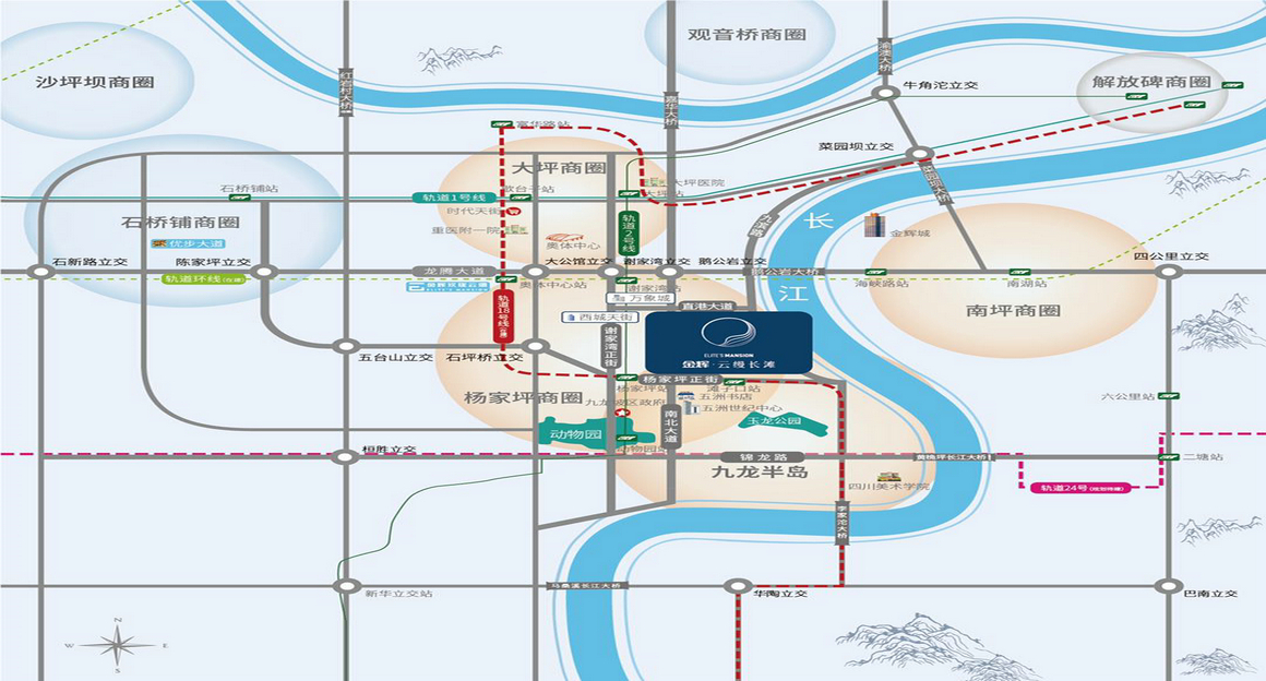 金辉·云缦长滩雄踞九龙坡核心板块九龙半岛核心位置,坐享杨家坪大商圈和九龙半岛醇熟资源配套,以及长江文化艺术湾区规划,一边是都会繁华,一边是人文艺术,繁华与人文艺术相融共进。