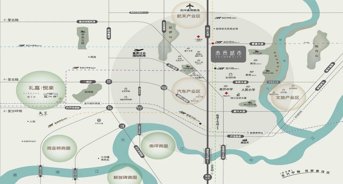 未来城市位于重庆两江新区龙兴地区两江大道,主要产品为高端别墅和洋房。未来城市地处龙兴核心板块未来的繁华区域,学校、公园、轻轨、商业中心等配套齐全。