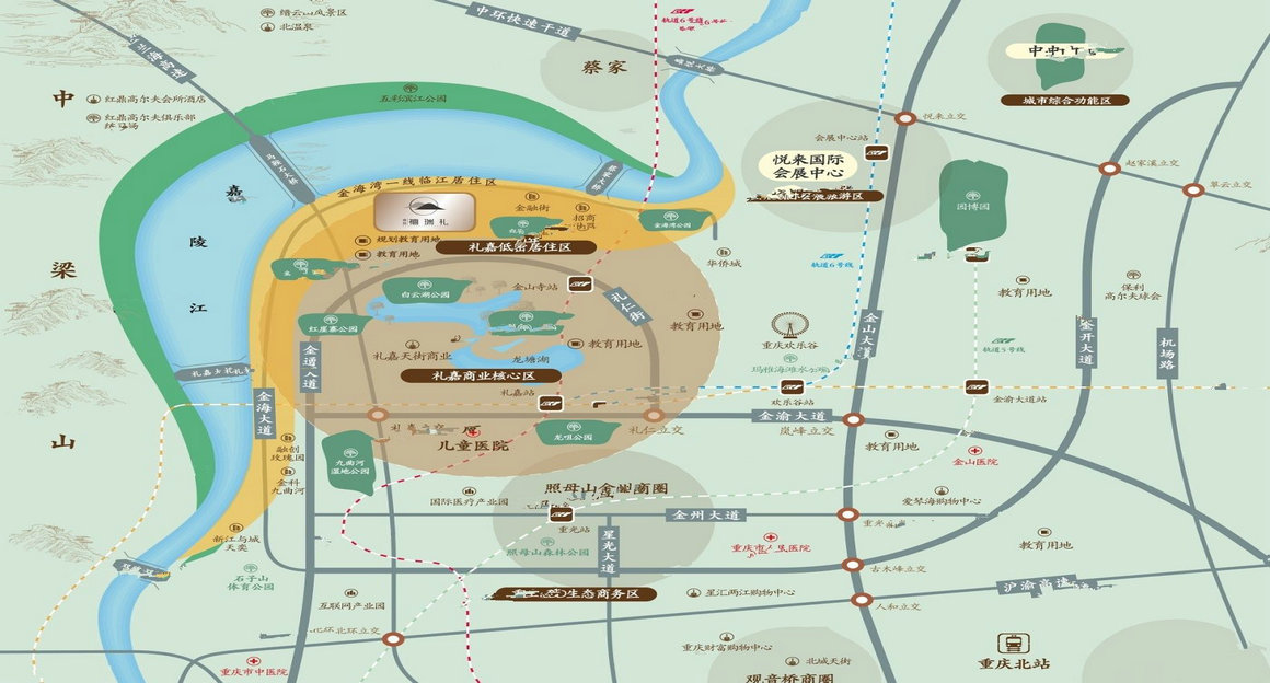 礼嘉天街商圈,锦绣山公园、北恒公园、龙潭公园、洪崖寨公园、九曲河湿地公园、白云湖公园等