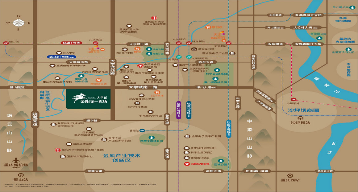 金阳第一农场大学城项目位居缙云山脚下之地,周边有大学城中央公园、鱼木石公园、大成湖公园、西湖湿地公园等市政公园,项目规划了别墅、小高层、商业等,主要设计刚性需求产品。