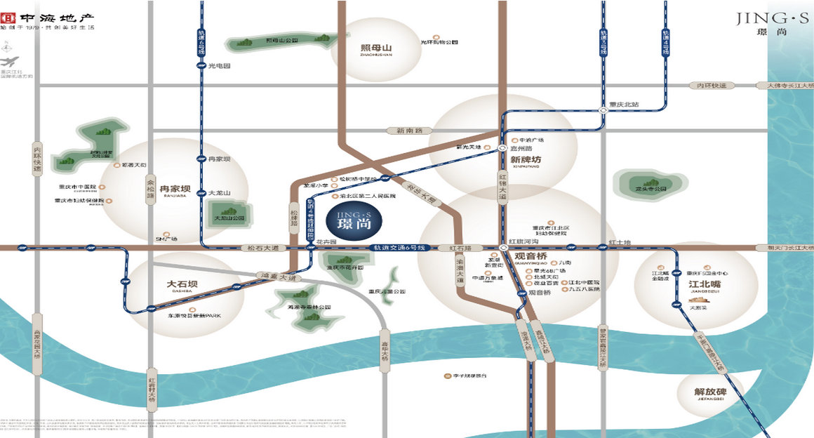 中海·璟尚项目位于重庆观音桥商圈红石路沿线,地处观音桥及嘉州商圈交汇处,享受两大千亿级商圈的顶级资源,拥有几大购物中心、多家民生医院、城市公园环绕、九街夜色等城市配套,共同铸就了项目独一无二的高端生活体系。