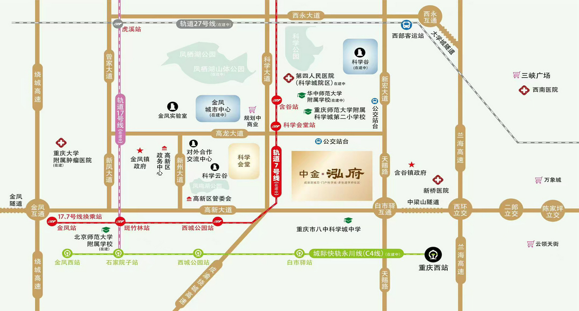 项目以极具前瞻性的视野择址科学会堂旁,高阶城市配套即刻坐享,以更近主城的门户地段,立序科学城极核生活区,铸造城市高端人居新标准。轨道、酒店、生态、教育、商业等资源升级完善,构建起“生活-工作-娱乐-购物-休闲”的综合城市模式,引领重庆超大规模的改善居住浪潮。
